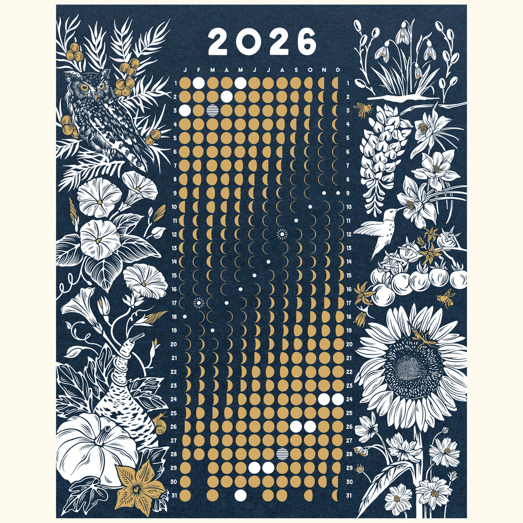 Limited edition hand pulled screen print. Illustrated and printed in my home studio. Each calendar shares the 2026 lunar phases, solar and lunar eclipses, as well as illustrations of the four seasons we have here in the Midwest.