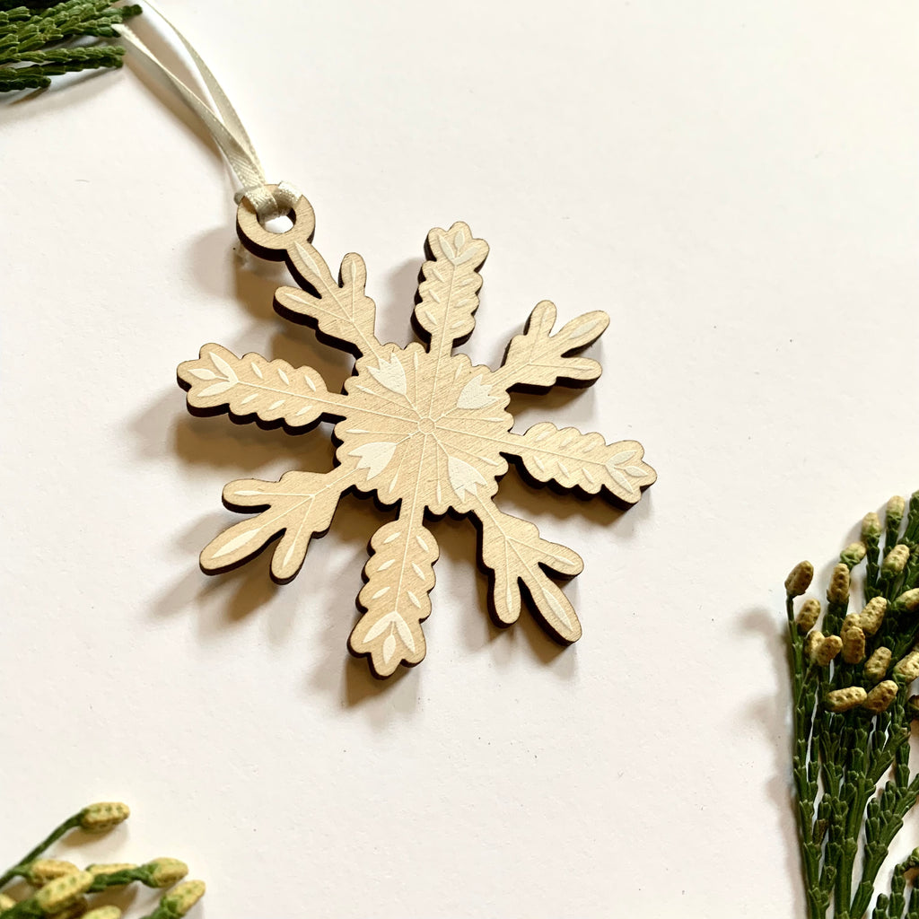 A delicate snowflake with a fine white print of tulips. Laser cut wooden ornament made from ethically sourced birch.