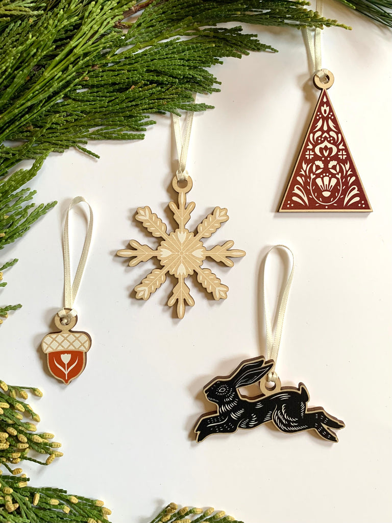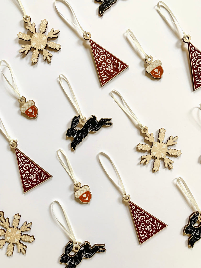 A simple triangle tree with detailed print in maroon and white. Laser cut wooden ornament made from ethically sourced birch.